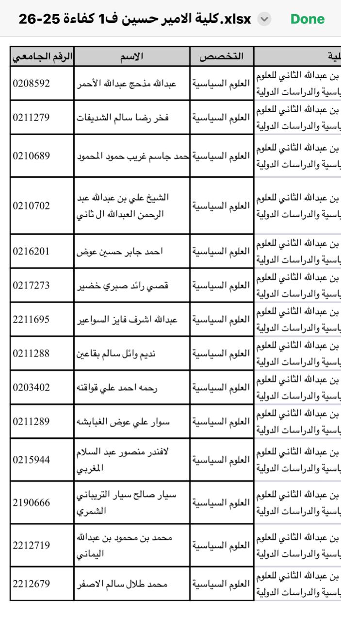 في المرفق بيانات الطلبة المتوقع تخرجهم نهاية الفصل الاول من العام الجامعي 2025/2026 من كلية الأمير الحسين بن عبدالله الثاني للعلوم السياسية و الدراسات الدولية والذين سيتقدمون لإمتحان الكفاءة الجامعية بتاريخ 8-12-2025